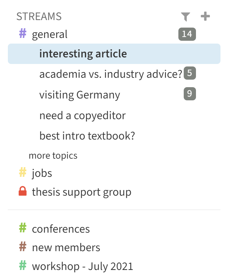 For more than a year, Zulip has been the cornerstone of our online Category Theory community. We greatly appreciate the seamless integration of Latex in every message as well as being able to get sidetracked (which, let's face it, happens a lot with mathematicians) without compromising an entire conversation: we can simply create a new topic for every tangent! Moreover, the flexible streams-and-topics system greatly helps us navigate through the constant influx of messages, as it is simple to tell if a message is relevant to one's interests.